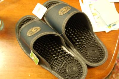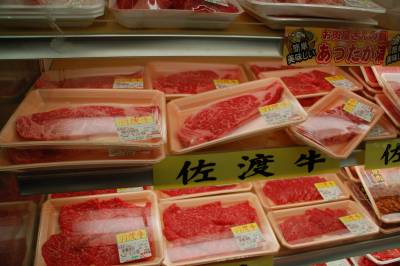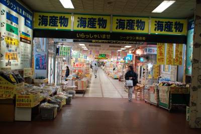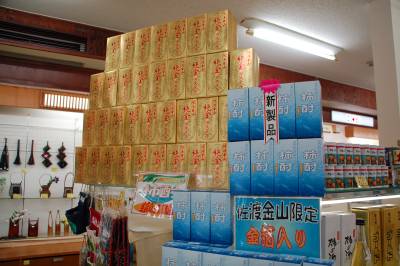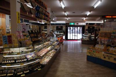 そんなこんなで無事、両津港に到着。 休日にもかかわらず、ご案内いただいた方とはここでお別れ。 さて、両津港のターミナルビルですが・・・2階に上がると写真のようなお土産物通りがあります。すでにお土産はたくさん買いこんであるので素通りしてしまいました・・・。(島内の大体のお土産はここで買えそうです)