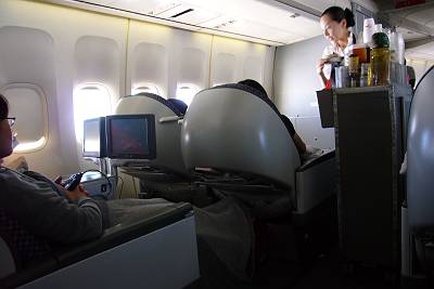 搭乗してみて、さらに驚いてしまいました。普通のビジネスシートではなく、ワールドビジネスクラスと呼ばれる新仕様のシートでした。 座席は最大176度までリクライニングするので、まさにフラットベッドです。(全長201cm) 機材変更に感謝、です♪