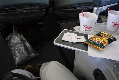 飛び立って間もなくしてドリンクサービスが始まりました。搭載されている個人用テレビも10.4インチあるそうです。今回は使いませんでしたが・・・。