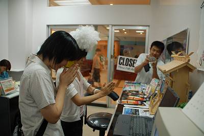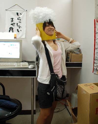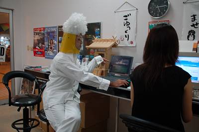 なにをするのかと見ていたら・・・、なんといきなりかぶりものの変装です! 変装をよくされるとは聞いていましたが・・・。まさか本当にやられるとは・・・。