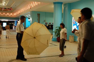 ロビー内で傘をさす人たちが・・・。