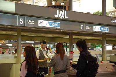 7:30だというのに、チェックインカウンターは長蛇の列ができていました。恒例の「ビジネスクラスカウンター」でチェックインです。意外に知られていませんが、JALのCLUB-A Goldがあればココが使えます♪
