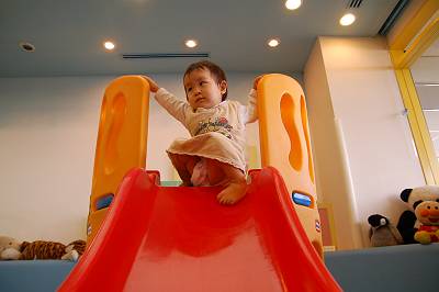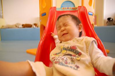 見てください、この顔。痛いとかそういうのではなくて、とても楽しい顔らしいです。落ちる感覚がたまらないらしく、何度もこの顔で滑ってました・・・。^^; |