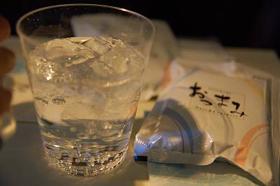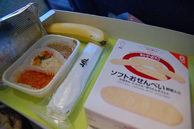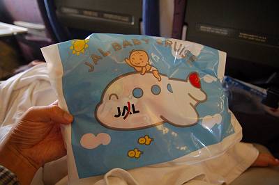 飲み物サービスが始まる前にこんなものをくれました。ぽんたごんの航空券を買ったときにリクエストしておいたオムツセットです。 |