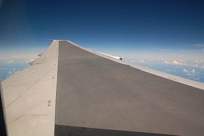 例によってスポットを離れてから離陸まで30分程かかりましたが、無事に飛び上がり一安心。 |