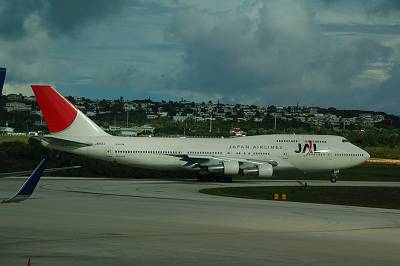 いろいろと忙しくしているうちに、定刻よりちょっと早い14:25グアムに到着。降りてすぐに搭乗機と記念撮影。 |