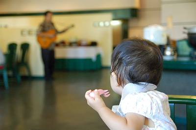 枝豆を食べていたぽんたごん、急に後ろを振り返りました。突然ギターを弾きながら歌う人が登場、音がするので気になったらしく・・・。 |
