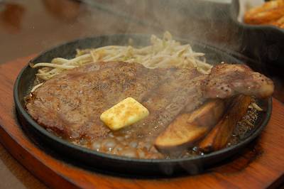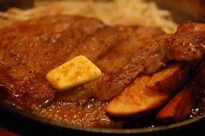 これは「リブアイステーキ」。肉を食べたい一心のサルきちのリクエストです。^^; 焼きたて(焼いている途中?)が出てきたので、湯気と一緒に♪ |