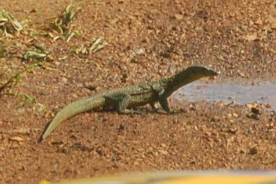 暑さに耐え切れず、走って車に向かうサルきち。 |