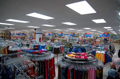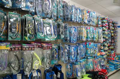 マリングッズのコーナー。種類もいろいろありますが、事前に日本で買われることをおススメします。(ネット通販で意外に良いものが安く買えます) |