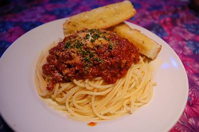 サルキチがチョイスした「ミートソース」です。 パスタランチにはガーリックトーストがついています。 |