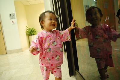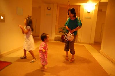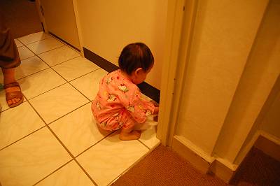 部屋の前に帰り着くなり行動を起こしはじめるぽんたごん。 サンダル脱いでます。^^ |