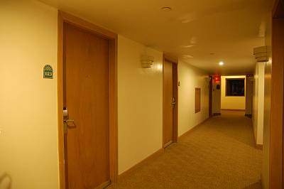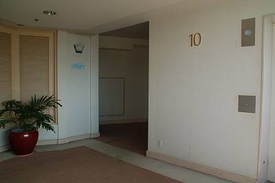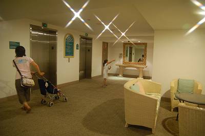 夕食を食べていないので、すぐにお出かけです。広いエレベーターホールには立派なソファーが。 |
