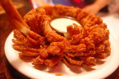 フライドオニオンにくらいつきます。 |