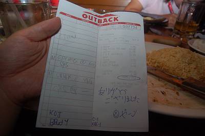 いきついた先はやっぱりステーキレストラン。日本でも見たことがある「OUTBACK」、ここに決定です。 |