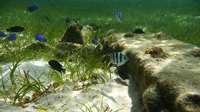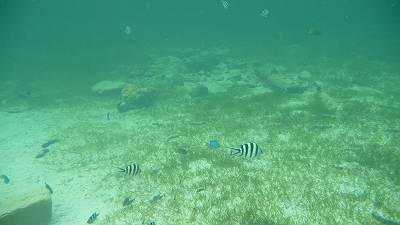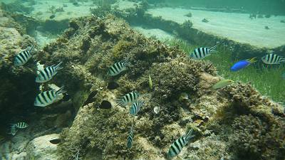 左側のエリア(遊泳区域ぎりぎり)にお魚さんのたくさんいるエリアを発見♪ |