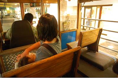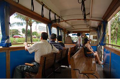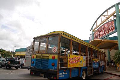 乗ったバスはタモントロリーと呼ばれるバスで、なんと側面が吹き抜けになっていて「窓」がありません。^^; スコールのときはビニールのカーテンを降ろす、といった作業が必要になります。 |