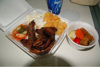 SAIPANDAのセレクト。韓国系のお店で「3チョイス$7」にしてみました♪ 骨付きカルビ、エビマヨネーズ、酢豚の3チョイスと、キムチ&マカロニサラダ&ライスです。