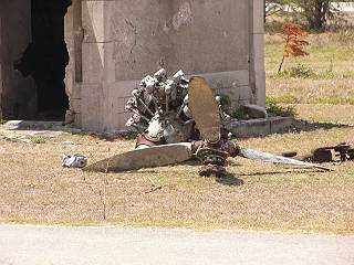 日本軍のものと思い、地元チャモロ人が命がけでテニアン港沖合から引き上げてきたものですが、調べてみるとアメリカ軍(グラマン機)のものであることが分かったそうです。日本人慰霊碑のそばに置いておくわけにも行かず、反対側に放置された状態が続いているそうです。 |