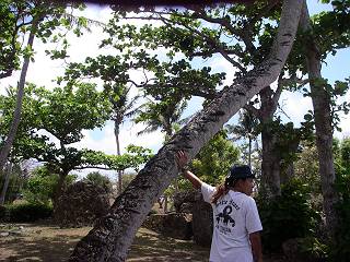 昨年グアム・ロタを直撃した台風(瞬間最大風速71m)の時、この硬いヤシの木が簡単に折れてしまったそうです。(写真)