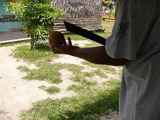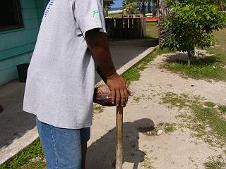 とがった木の棒に力いっぱいヤシの身を突き刺します。