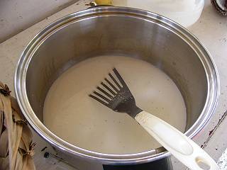 身を搾りだしたあと、こしてココナッツミルクだけにします。 |