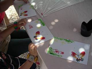 バナナの葉っぱを切って、その切り口に絵の具をつけてハガキに押し当てていきます。 |