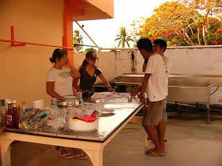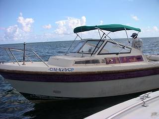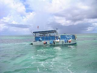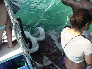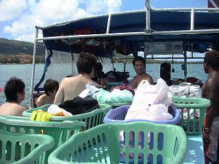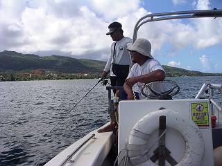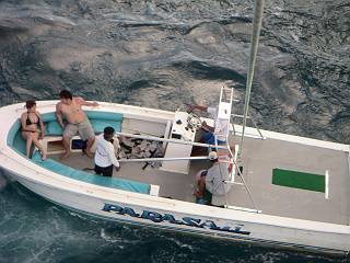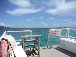 この船は後部が平らになっているのが特徴的です。インストラクターさんは釣りが趣味なのでしょうか、常に釣りをしておりました・・・。 |