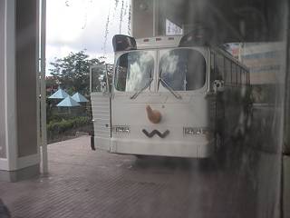 ワールドリゾートホテルに着くと、見慣れないバスがありました。なにかニョキっと出ていますが・・・、前を見てみると・・・ |