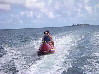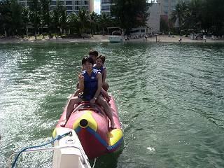 もっとひどいのが、バナナボートによじ登ること。コツを掴まないといくらやっても登れません。力任せにしないことが一番のコツでしょうか。 |