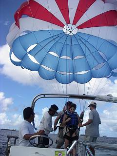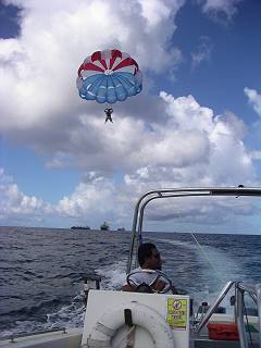 バナナボートが終わると一隻の船が近づいてきました。その船に乗り換え、今度はパラセイリングです。