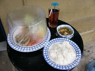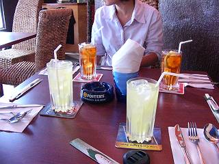 この日の飲み物は、レモネードかアイスティー。お替りは自由なようです。飲み干すと、「お替りは?」と聞いてきます。 |