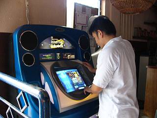 ヨーさんがいない・・・と思ったら、何やら妙な機械の前にいました。この機械は「インターネットジュークボックス」と言って、お金を払って店内に曲を流すものです。1$で3曲選べるので、なかなかお手軽です。テンポの良い曲が店内に響き渡りました。