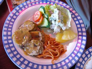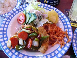白身魚のムニエルに野菜炒め(酢豚の豚なし状態・・・)が添えられたものです。こちらもやはりものすごい量があります。管理人はこちらを選びましたが、全部食べれませんでした・・・。