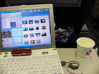 寝ることも無く、飛行中はPCをカタカタと・・・。