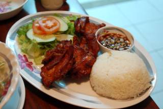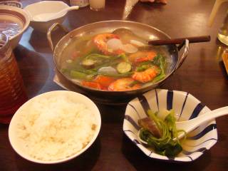 | おすすめメニュー 「シネガンスープ定食」$15 こちらはフィリピン料理です。とても酸っぱいのですが、管理人はコッテリ系の食事を一定量食べるとこれが欲しくなります。 海老はあたまの外側をはずしてそのままバリバリといけます。これがまた美味しいのです♪ |