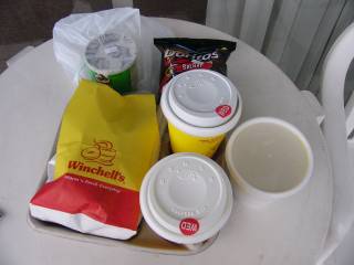 | お店で食べるのはどうも・・・という人にはテイクアウトがオススメ。 最初に食べるか持ち帰りか聞かれるので「テイクアウトプリーズ!」と答えましょう。 左の写真のような感じでトレーに入れて持ち帰ります。 開けるとこんな感じです。 ホテルのバルコニーでこんな朝食も一興です。 |