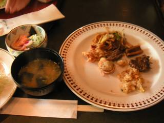 | これはビーフステーキランチです。 メインプレートは左側の白い皿、右側の大きい皿がビュッフェコーナーから持ってきたものです。 |