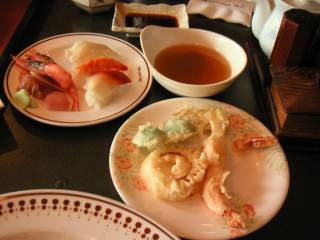 | 天ぷらはその場で揚げたてをいただきます。 刺身も取り放題です。 |