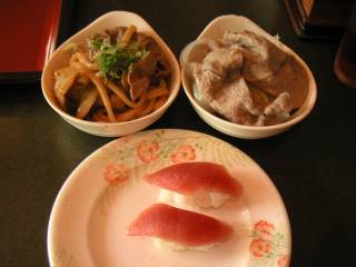 | すき焼(左)、しゃぶしゃぶ(右)とお寿司です。 ウェイトレスさんが沢山盛ってくれました・・・。 |