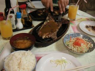 | 写真はコースA Tボーンステーキ(500g)、 シーフード鉄板焼き、 サラダ、ライス、スープ がついて $18(但し2人から) ステーキは500gと、十分な量があります。 |