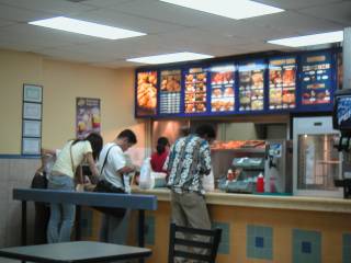 | 店内に入ると、とてもきれいでびっくりします。雰囲気が日本のファーストフードと変わりありません。 メニューは所々日本語で書かれているので、頼むのも楽チンです。 夕食時は結構人が入っているようです。 |