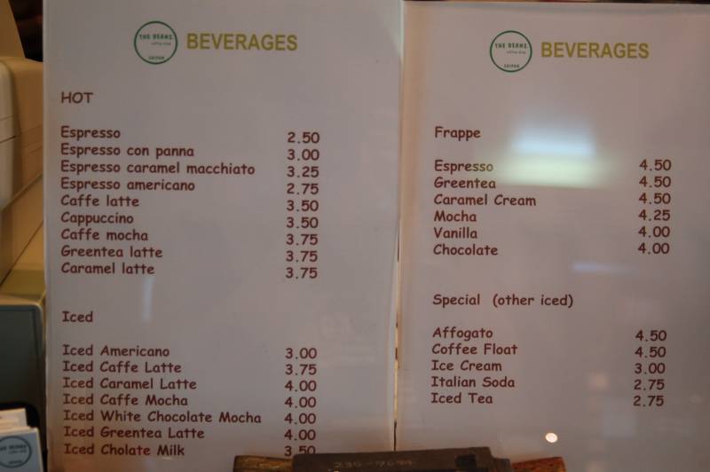 ここのメニューです。ホットやアイス、フラッペ等、ひととおり揃っています。(写真拡大できます) |