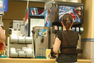 ドリンクはセルフになっているので、カップをもらったら自分で好きなものを入れます。もちろん、ぶれんどもあり♪(勇気のある方は挑戦してみては・・・?) |