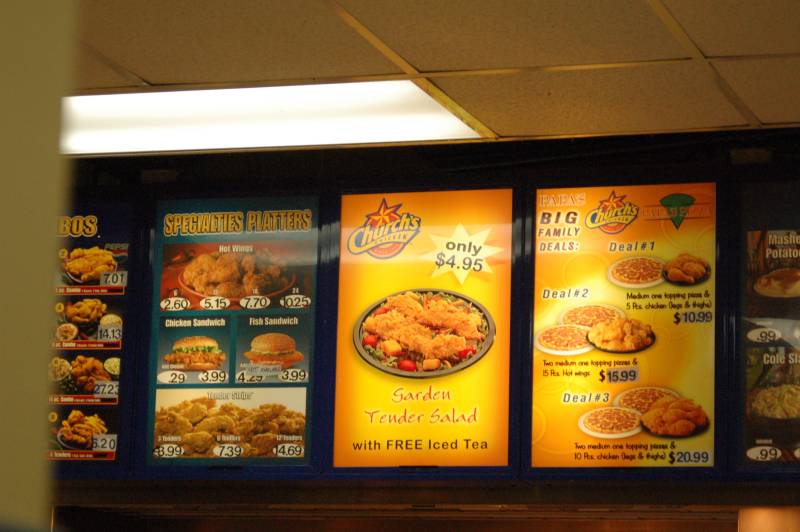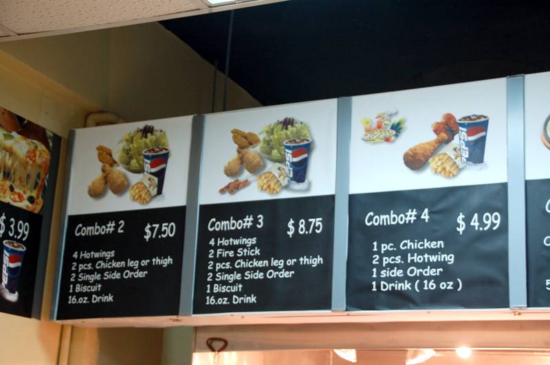 | 店外に大きく飾られているメニューそのC お持ち帰りメニューも充実しています。 |