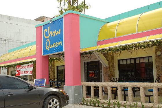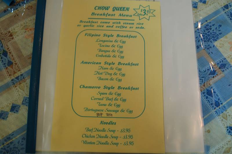 | Chow Queen はグランドホテルのちょうど目の前に位置します。(昔ゴールデンロブスターレストランがあったところです) 昼食は行ったことが無いので分かりませんが、「朝食を軽く食べたい人向け」のお店です。右写真のt通り、朝食は$3.95となっています。 |