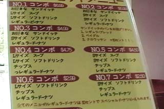 | こちらはNo.2コンボ($5.99)です。内容は下記の通り。 ・すきなサンドイッチ ・Sサイズ スープ ・Sサイズソフトドリンク ・レギュラードーナツ 各1個 サンドイッチはツナ,ハム,ローストビーフ,BLT等、結構選べます。 |