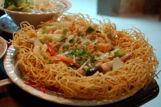 これは正式名称がわかりませんが・・・(写真で見て頼んだので・・・)固焼きそばです。並みの量ではありません・・・。皿の大きさが40cm位ありますので、一人で食べるのは不可能かと・・・。 |