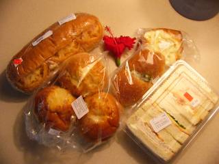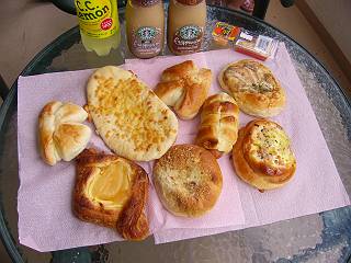 焼きたてパンの一例です。 どれも美味しいものばかりです♪ ちなみにここで食事をすることも可能で、いろいろなメニューがあります。 夕方6時以降に行くと良い事があるかも・・・? |