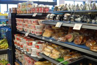 | 場所はDOLPHIN WHOLESALE STORE の隣にあります。 (写真左下のフードスタンドが目印です) 店内は食料品がたくさんあり、棚にぎっしりと陳列されています。入り口に近いところにパン類も売っています。 |